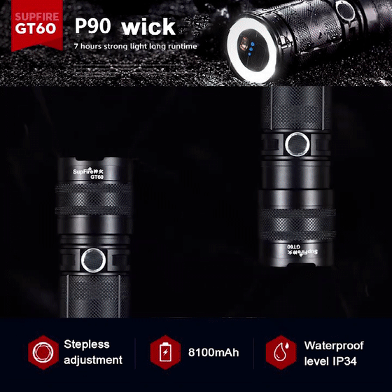 【Super Bright】GT60 utilizes a P90 wick, which can provide a maximum output of 10000 lumens and a beam distance of 300 meters. Press the central switch to turn on the low light gear, continue pressing to adjust the gear (weak-medium-strong-strobe-off), and long press for 2 seconds to turn off at any time. The tail switch can turn on the floodlight to meet the needs of use in different scenarios.